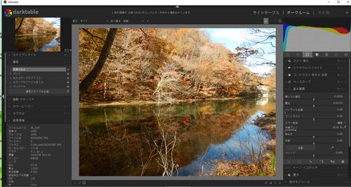 ダークルームの構成 ライトテーブルの紅葉の画像をダブルクリックして、ダークルームに移動すると、次の画面になります。 ダークルークでは、中央に編集する画像が表示されます。左側の上には、サムネイル画像が表示されます。中央の画像をズームして、画像…