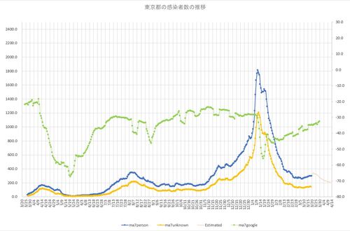 3月第3週の東京都の感染者数のまとめ 3月の第3週も終わるので、今週の3月20日までの感染者データをまとめておきます。 Google Transitデータも更新しました。 Googleの予測データも、3月17日版に更新して、これも7日移動平均をEstimatedでプロットしてあ…