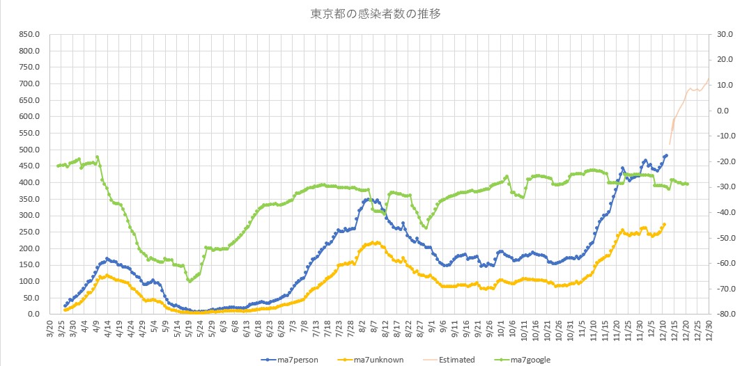Googleの予測データも、12月9日版に更新して、これも7日移動平均をEstimatedでプロットしてあります。