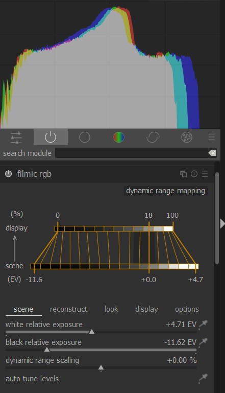 Aurelien Pierre(オーレリアン ピエール)さんは、Darktableのパイプラインは、モジュールが相互に関係しないように設計されているため、フィルミックRGBは露出モジュールから露出値を取得できず、フラットな+ 0.5EVを想定しているといっています。
