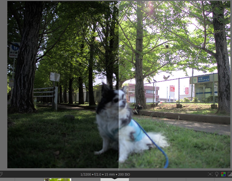 写真1は、左右に分かれていますが、左は現像前の露光補正をしていない画像で、右は露光補正をした画像です。左の画像をみると、被写体の犬の部分が暗くなっています。これが、自動焦点があわない原因です。オリンパスはE-PL6などのペンシリーズの自動焦点にあうEVの範囲を公開していませんが、古いカメラですので、Kiss Mより若干悪い程度だと思います。使っているレンズはF2.0ですので、上記のKiss Mと同じ条件です。