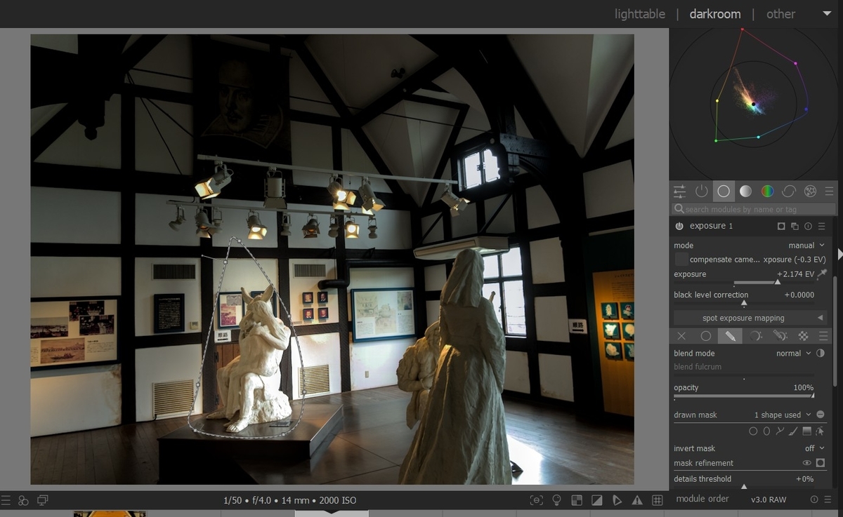 写真1は、人物の彫像に光が当たっていますが、窓からの光線が強くて、ライティングの効果が見えません。写真1では、露光モジュールの新しいインスタンスをつくり、パスマスクを追加しています。