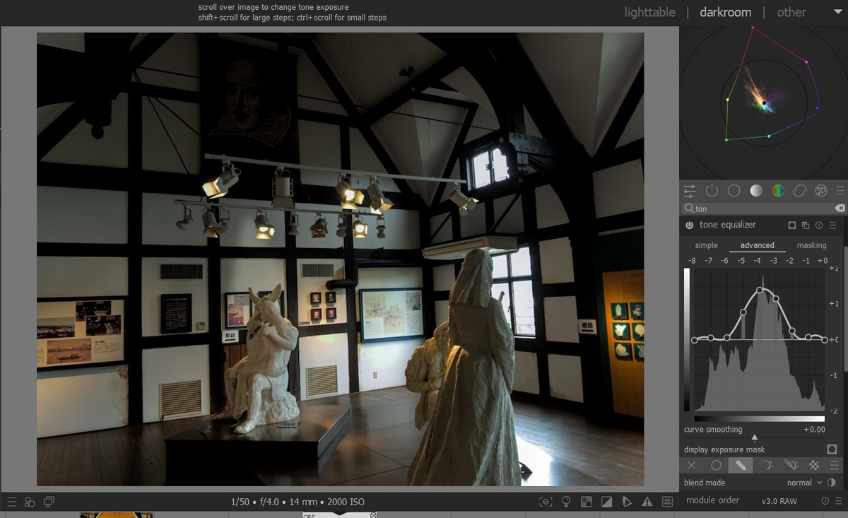 というわけで、「トーン イコライザー モジュールまたはマスクを描画した露光モジュール」の使い方を説明します。