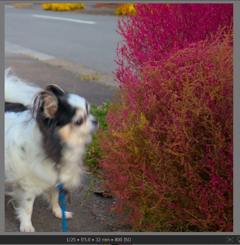 写真1は、犬の散歩の写真で、ぶれています。シャッター速度は、1/25秒と長いですが、コキアはブレていませんので、この写真のブレは、被写体ぶれです。