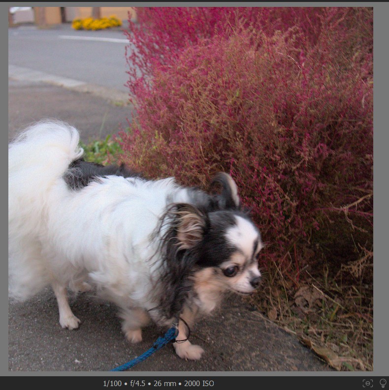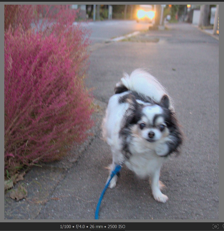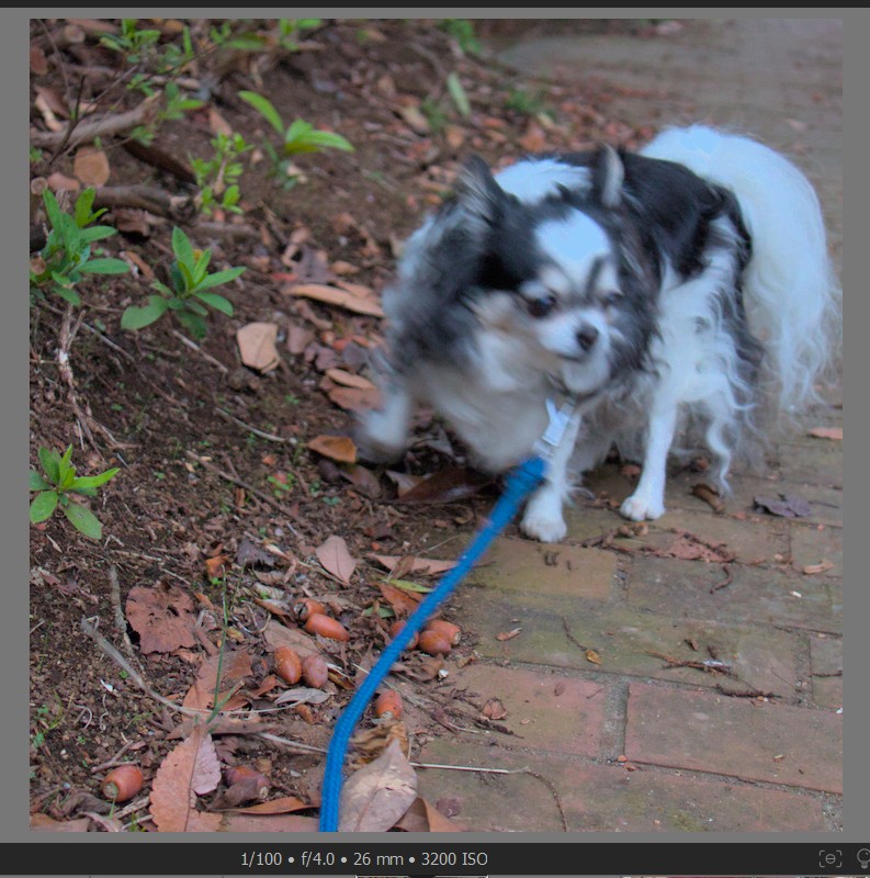 つまり、飛行犬ほどでなくとも、シャッター速度がある程度短くないと、散歩時の犬の写真は、被写体ぶれが生じます。