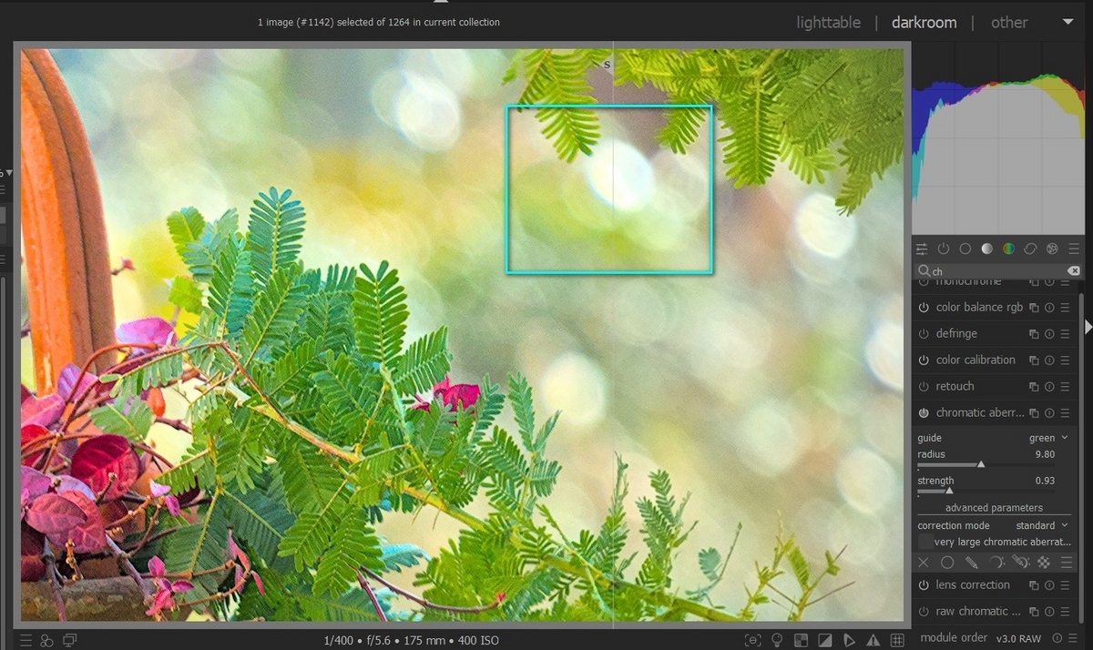 写真2の、右では、darktableの色収差補正をかけています。