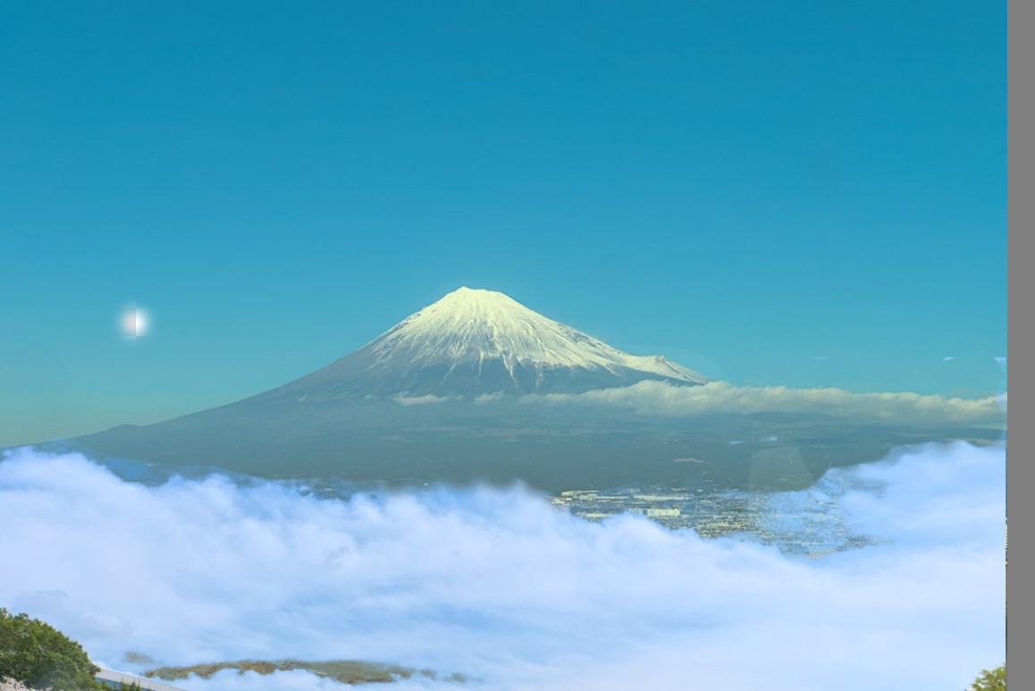 2023-04-10 霧の表現(2) Kritaで雲の画像をオーバーレイしてみました。 霧というより、雲かもしれません。 ホワイトバランスがあっていない問題点はありますが、実際の霧では、霧が、希望した部分だけをマスクすることは不可能なので、合成でよい気がします。 後で、色を合わせるのは容易でないので、オーバーレイする写真の色温度を事前に揃えておくべきだと思いました。 富士山の写真は、窓の反射が写っています。 写真1